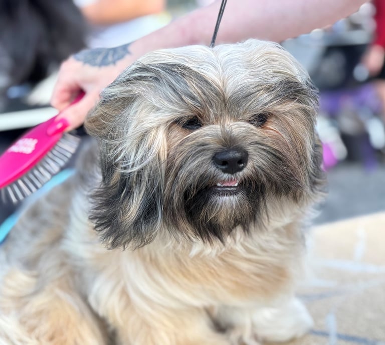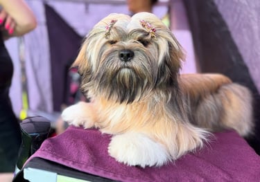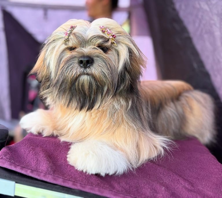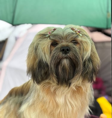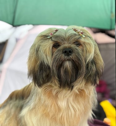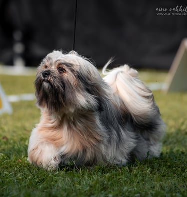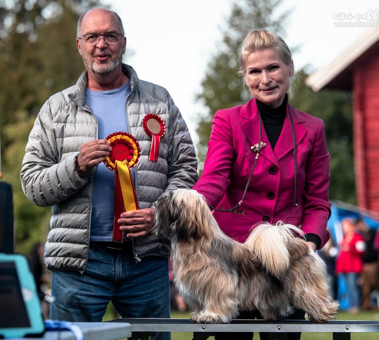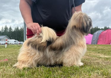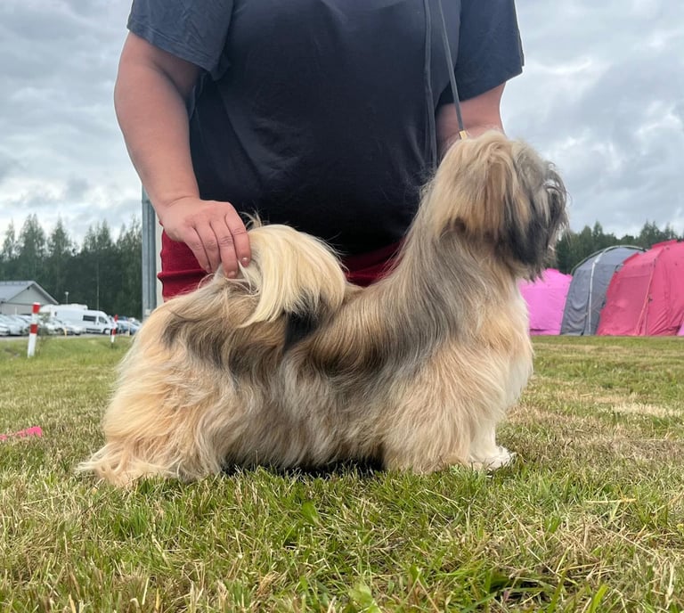 “Very good type. Beautiful topline. Lovely expression. Good front and chest. Strong, good back. Well angulated in the rear. Good tail set. Excellent coat quality. Beautiful long neck. Moves beautifully with the correct Lhasa Apso attitude. Beautifully groomed coat.”