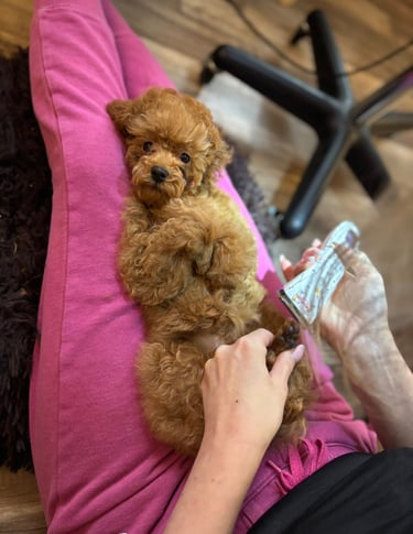Next up was the nail cutting. Gigi was still half-asleep, which made the task a bit easier. She didn't enjoy it, but she tolerated it with the patience of a seasoned show dog. It's so important to start them early, especially since Gigi is destined to be a show dog. A year from now, her long, flowing coat will require regular grooming sessions.